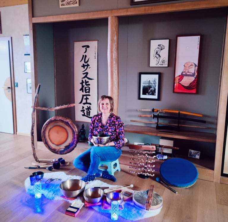 Description : séances de voyages sonores en groupe (environ 1h15) dans divers lieu en Alsace et Lorraine, massages sonores aux bols tibétains en individuel ou en duo (1h30), accompagnement au chant intuitif en individuel ou en groupe (1h30 en moyenne), ateliers d'éveil musical, chant et voyage sonore pour les enfants dans les écoles, les crèches et en associations. Voyages sonores sur demande à domicile ou en entreprise. Toutes ce séances sont accompagnées d'instruments du monde tels que les bols tibétains posés sur le corps ou non, le Gong, le tambour, le tambour océan, le piano à pouce, le carillon, etc.... Lors du massage sonore, les bols chantants sont posés sur le corps devant et derrière selon le besoin. La personne est habillée et allongée ou assise et recouverte d'une couverture.
