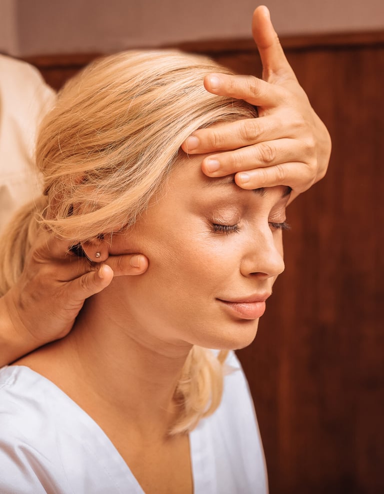 Le soin débute par des gestes enveloppants et fluides sur le visage et le décolleté, favorisant une première relaxation et une mise en confiance.
