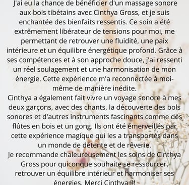 Les prestations proposées, incluant le massage sonore et les autres prestations, sont des méthodes de relaxation et de bien-être.